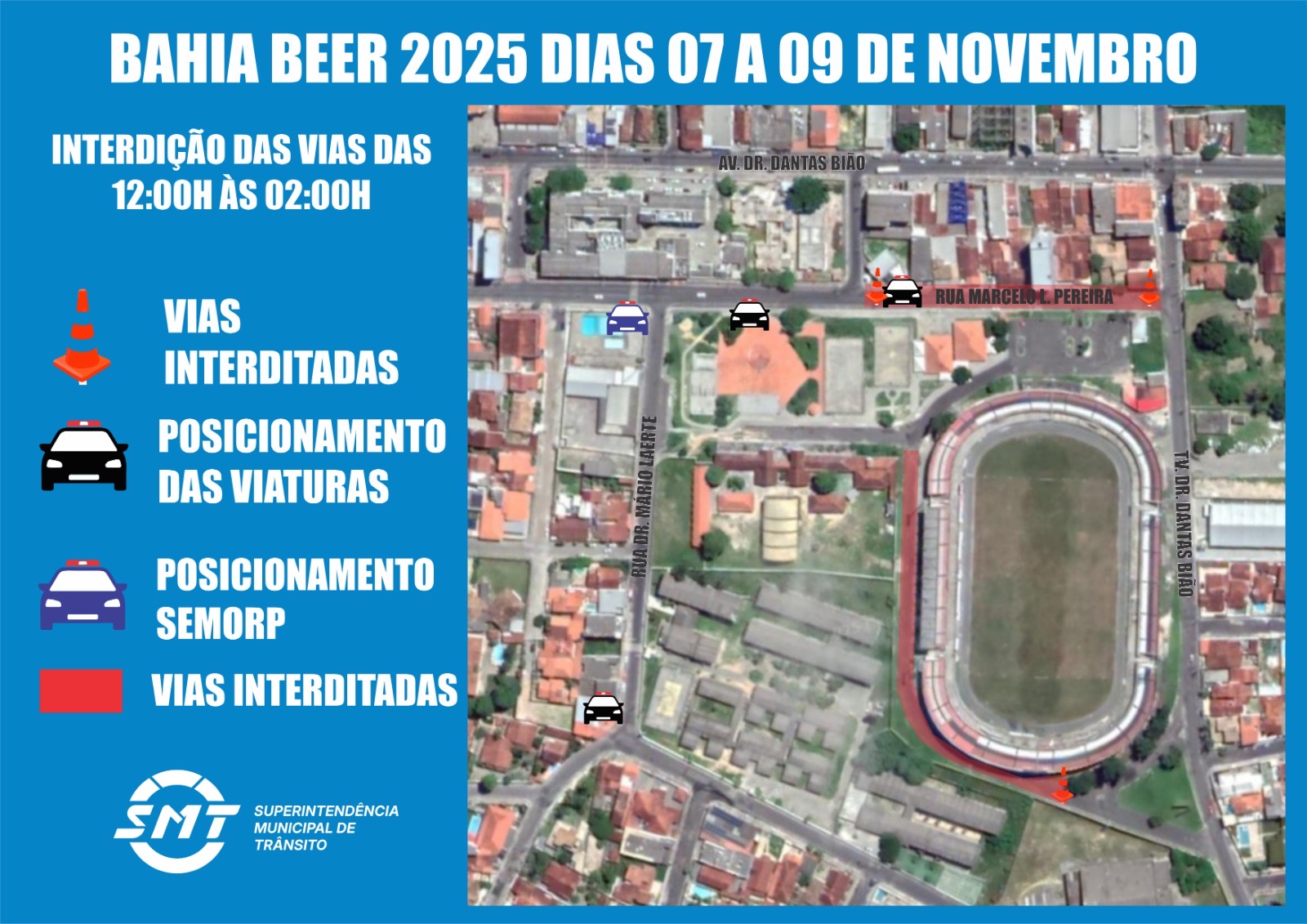 A Superintendência Municipal de Trânsito (SMT) informa que, entre os dias 07 a 09 de novembro, será realizado o *BAHIA BEER- Festival da Cerveja* no *Praça Mário Laerte*, com intervenções previstas por esse período.Com o objetivo de minimizar os impactos no trânsito, garantir a ordem e assegurar a segurança viária nas imediações do estádio, a SMT adotará intervenções temporárias no tráfego durante os três dias do evento.*As medidas de trânsito incluem:*• Permissão de estacionamento na ciclofaixa, no trecho entre a *Santa Casa de Alagoinhas* e a esquina do *Hospital Regional Dantas Bião*;• *Rua Maria Feijó/Tênis Clube*, sentido único de circulação em direção a Rua 13 de Junho.• A Rua Marcelo L. Pereira estará interditada parcialmente.O acesso será permitido para a clínica veterinária 24h.Agentes da SMT estarão presentes para orientar condutores e garantir a segurança e a fluidez do tráfego. A colaboração de todos é essencial para o bom andamento do evento.Superintendência Municipal de Trânsito